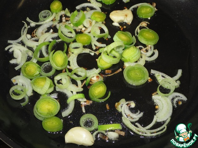 Лук, почистить и нарезать полукольцами. На сковородку влить растительное масло и обжарить до мягкости лук и чеснок.