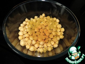 В отваренный Нут добавить карри и соль по вкусу. Перемешать.