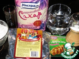 Нам понадобится: Мука пшеничная и ржаная, сахар Мистраль, солод, дрожжи, соль, тмин, темное пиво, кипяток.