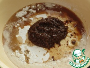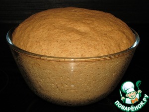 Сложить все ингредиенты для теста в чашу комбайна, добавить заварку ржаную, замесить тесто в течение 10 минут, до эластичности. Тесто по консистенции очень мягкое, на дне чаши мажется, прилипает к рукам.