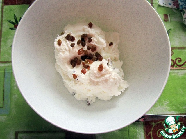 Для начала, нам нужна качественная, свежая творожная масса. К творогу добавляем изюм и ванильный сахар. Хотя, конечно, можно купить уже с добавками)