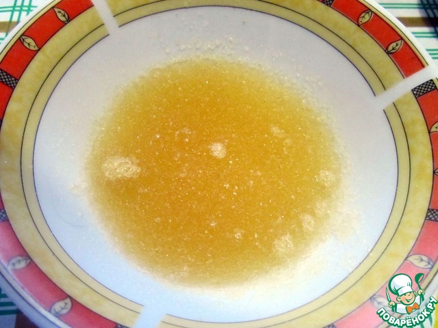 15г желатина замочить в холодной воде (3 ст. л) и дать набухнуть, после чего распустить на водяной бане и ввести в творожную массу. Количество желатина зависит от консистенции вашей творожной массы, у меня была густая (держалась на ложке), поэтому я взяла 15 г, для более жидкой, берите больше желатина (25-30 г).