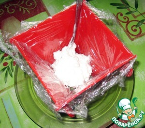 Пасочницу застилаем пищевой пленкой и выкладываем в нее творожную массу.