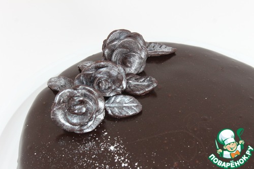 Перед работой с шоколадной мастикий ее необходимо охладить и работать очень быстро через пленку или в перчатках, иначе она от тепла рук будет слишком мягкой. вырезать кружки, сделать из них розочки и лепестки. Покрыть декор кандурином.