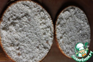 Круглый белый корж разрезать повдоль на 2 коржа и пропитать сиропом