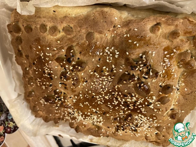 Вторую часть теста раскатать и накрыть начинку. Края пирога защипнуть, смазать взбитым желтком и посыпать кунжутом. -