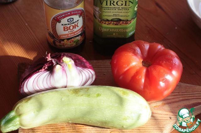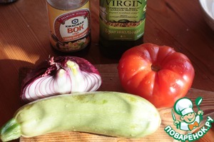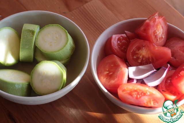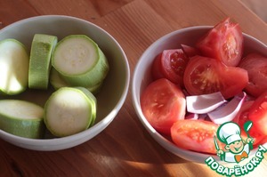 Кабачок нарезаем кольцами толщиной около 1 см, помидор разрезаем на дольки тоже толщиной 1 см, лук на четвертинки.