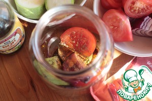 Укладываем овощи друг на друга слоями, каждый слой поливая маслом, соусом и посыпая перцем.