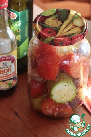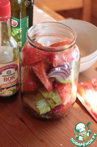 Закройте банку крышкой и энергично встряхните. Важно, чтобы все овощи были покрыты соусом. Оставьте мариноваться на 1-2 часа.