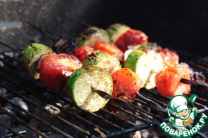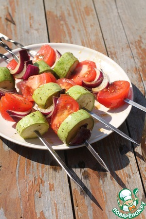 Приготовьте угли, пока они разогреваются, нанизываем наши овощи на шампуры, чередуя их.