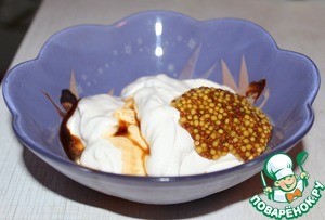 Смешать сметану, горчицу и 1 ч. л. соевого соуса. -