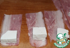 Брынзу нарезать и обернуть ломтиками бекона. -