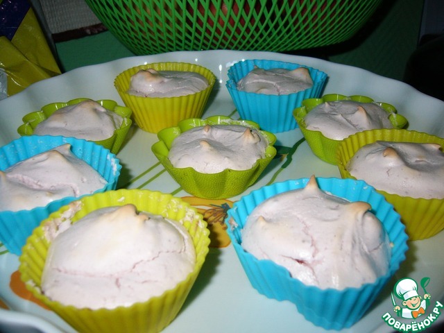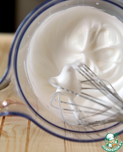 Теперь взбиваем белки (50г) с сахарной пудрой до крутых пиков (параллельно разогревая духовку до 190 градусов)...