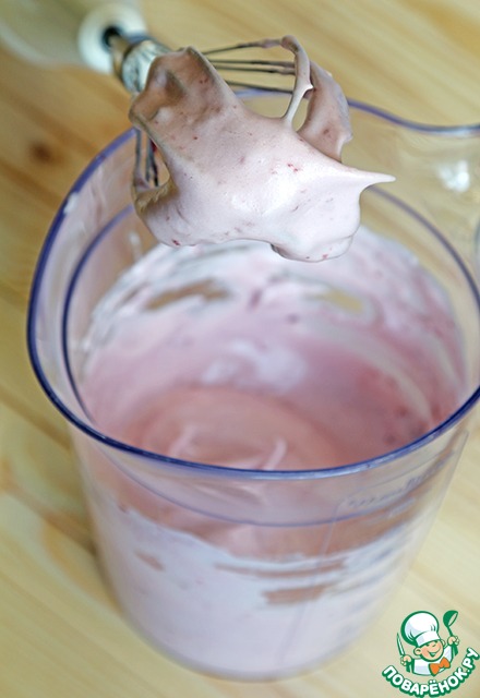 ... за тем на средних оборотах миксера постепенно вводим вишневую массу (она должна быть достаточно теплой, подогрейте немного, если успела совсем остыть). Получается вот такая воздушная заготовка.