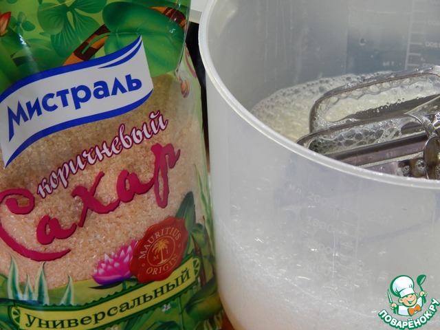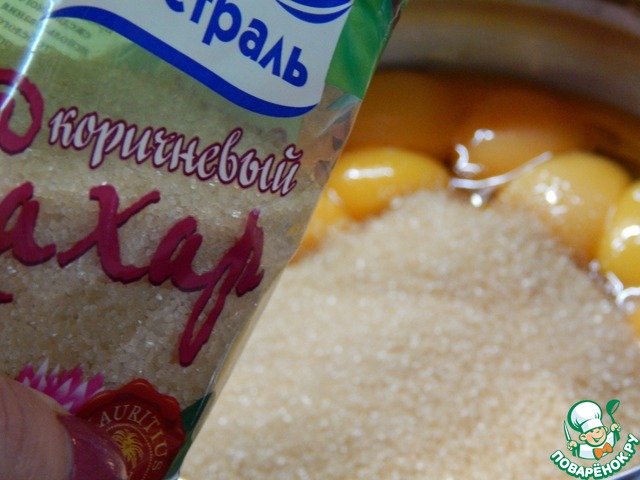 Взбить яичные желтки с 200 гр коричневого сахара.