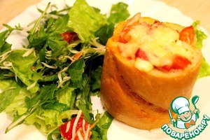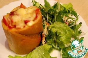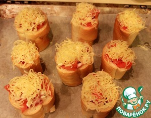 Включить духовку на 160 С. Противень застелить пекарской бумагой, и смазать маслом. Каждый багет разрезать сначала пополам, затем каждую половинку ещё раз пополам. Отрезать твёрдые хвостики багета. У Вас получится 4 стаканчика из каждого багета. Удалить мякиш из стаканчиков, оставив дно.