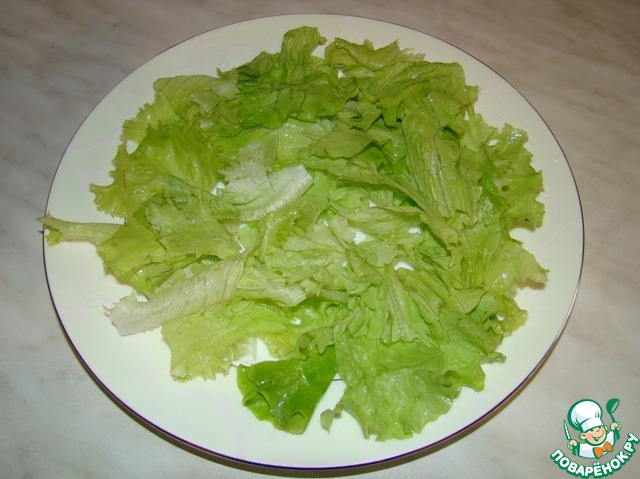 Вымоем и высушим салат. Порвем его на порционную тарелку.