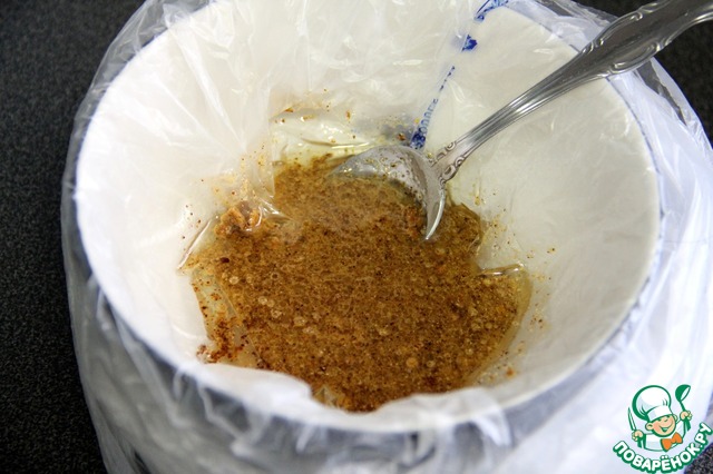 Сначала готовим маринад: 1ст. л. растительного масла, 2 ст. л. уксуса красного вина, 1 ч. л. красного перца, 1 ч. л. имбирного корня, 2 ч. л. порошка чеснока смешать в пакете.