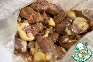 Положить в пакет к маринаду, завязать и хорошо перемешать. Поставить в холодильник мариноватся на 2 часа.