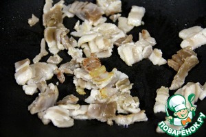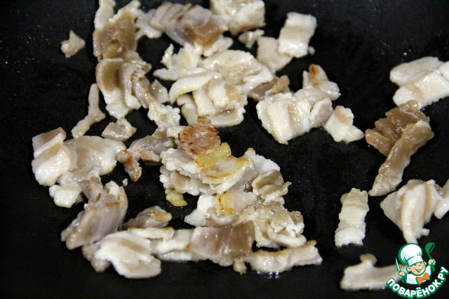 4 кусочка бекона мелко режем и обжариваем в сковороде - вок.