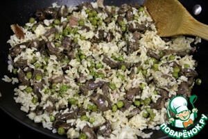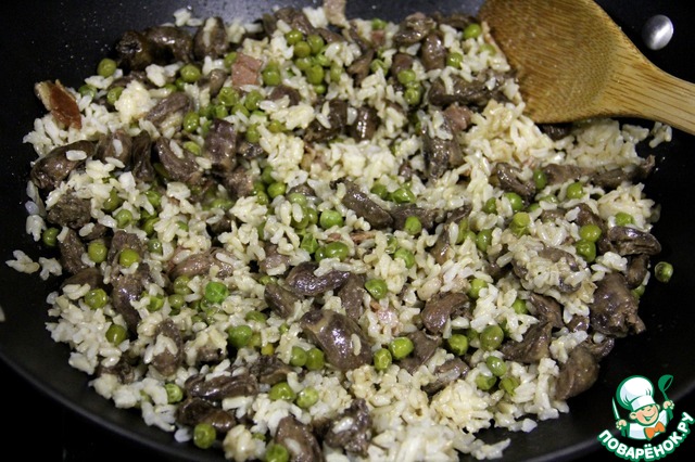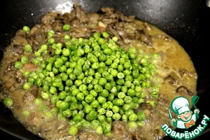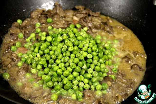 Добавляем сердечки и тушим почти до готовности. Добавляем горох (замороженный) и доводим до готовности.