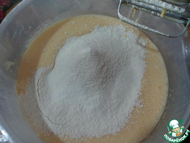 Кладем просеянную с разрыхлителем муку и перемешиваем миксером на низкой скорости.