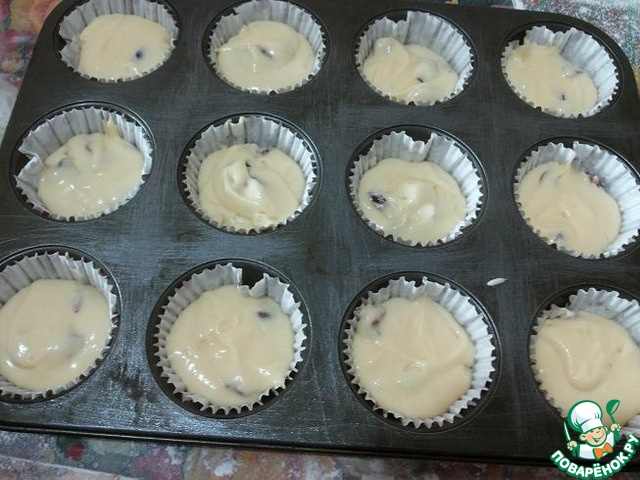 Смазываем специальную формочку для кексов маслом или вставляем бумажные розетки. Ложкой распределяем тесто.