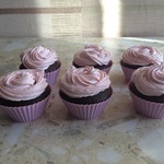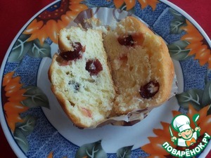 Для "шапочки" приготовить швейцарское безе: яичные белки взбивать с сахарной пудрой и ванилином на водяной бане на высокой скорости миксера 7-8 минут. Так как у меня кексы с клюквой, то я решила добавить немного клюквенного сока и подкрасить безе в розовый цвет. Положить массу в кондитерский мешок с насадкой и выдавить сверху на кексы. Получилось очень красиво!