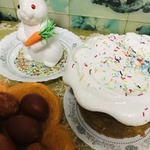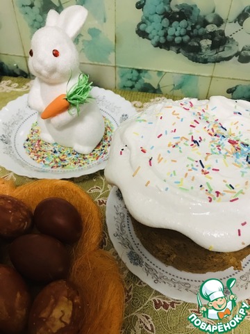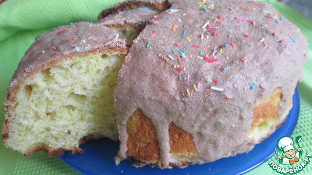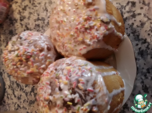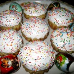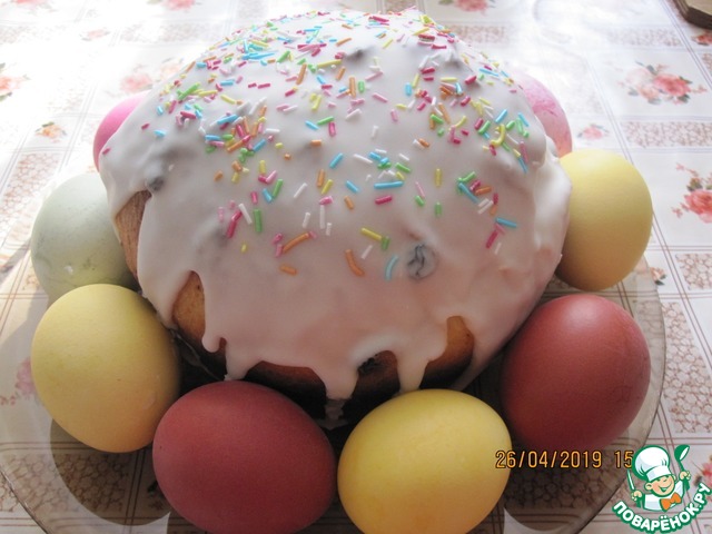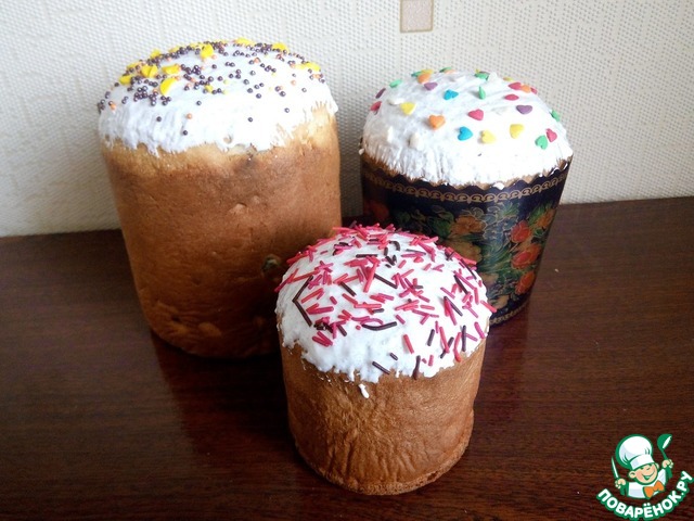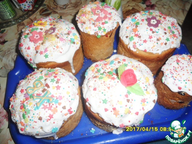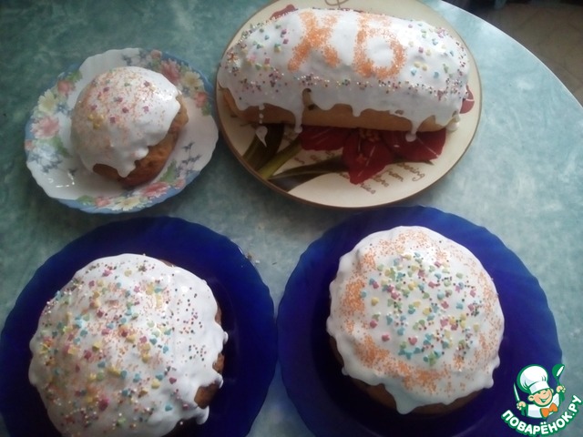 После того как куличи спеклись, оставляем их остывать на решетке. Остывшие куличи покрываем глазурью и посыпаем кондитерской посыпкой. Глазурь я готовлю по рецепту Наташеньки (natalina79) вот из этого рецепта http://www.povarenok .ru/recipes/show/743 44/