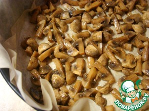 Дно и стенки формы для запекания смазать растительным маслом. Застелить пергаментом, также смазанным маслом. Ну, а теперь начинаем укладывать наши слои. Первым идет слой грибов.