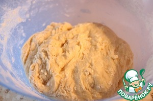 5. Добавить смесь в тесто, хорошо размешать. Добавить оставшуюся муку и замесить пластичное, не слишком тугое тесто. Поставить тесто подходить в тёплое место на 50-60 минут.