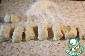 Тесто обмять, раскатать, разделить на небольшие кусочки. -