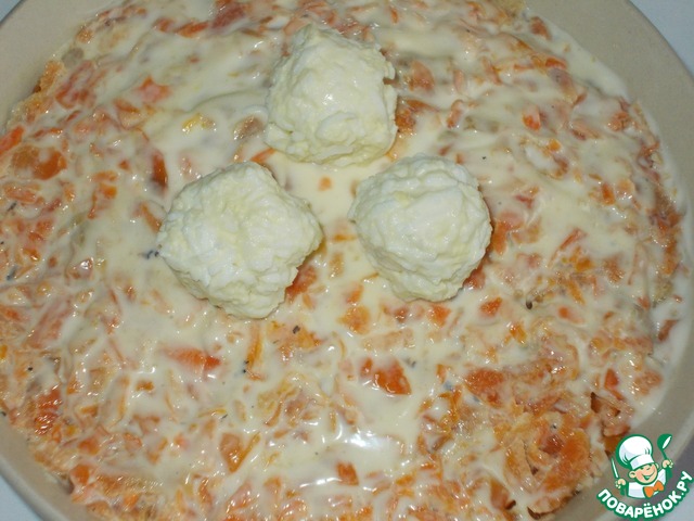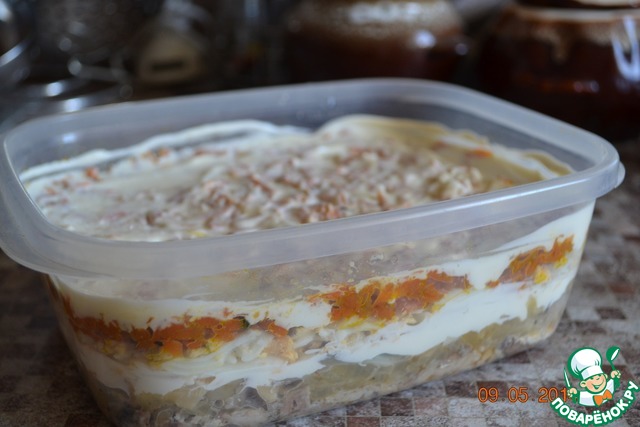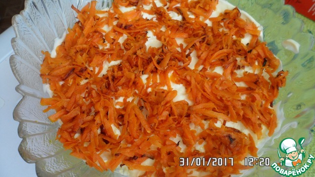 Последний слой жареная морковь и майонез! Этот слой, можно промазать чуть-чуть больше, чтобы морковь не сохла.