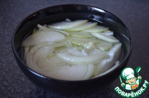 Лук почистить, порезать полукольцами. В пол стакана тёплой воды добавить уксус, соль, сахар, залить этим маринадом порезанный лук и замариновать, на 1,5 часа.