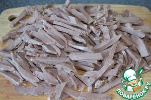 Готовое сердце очистить полностью от жира и порезать тонкими брусочками.