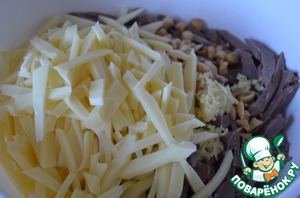 Сыр порезать тоненькими брусочками. Можно натереть на крупной тёрке, но вкус будет уже другой. Маринованный лук отжать и добавить в салат.