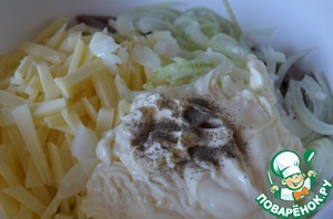 Добавить майонез и перец, немного подсолить и хорошо перемешать.