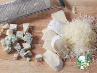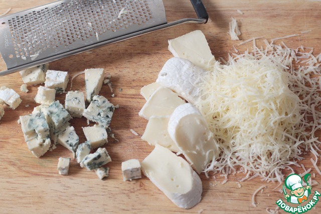 Приготовим нашу заливку. Для этого голубой сыр нарежем кубиками, бри полосками, а пармезан натрем на меткой терке. |