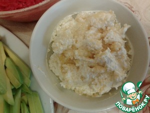 Столовую ложку икры смешать с половиной упаковки творожного сыра.