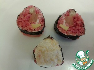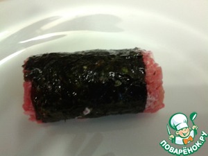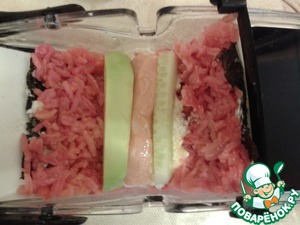 покрытый полиэтиленом) положить пластинку нори, смазать творожно-икорной смесью (если для мужчин, то можно смазать хреном со сливками), потом слой риса, затем немного творожно-икорной смеси, рыбу и овощи. -