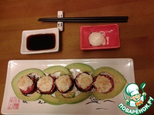Моя дочка и муж обожают роллы, да вот беда, после посещения суши-баров уже несколько раз у них были проблемы. Вот мне и пришлось самой осваивать новые рецепты. Ну и как водится в доме не всегда оказывается рисовый уксус или икра летучей рыбы, а также имбирь, васаби и прочее. Пришлось придумать свой рецепт из того, что всегда под рукой