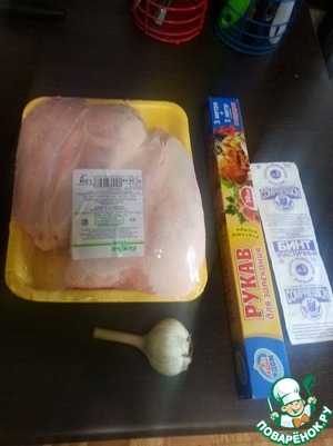 Приготовим все ингредиенты: куриная грудка, соль, перец, приправы по желанию, чеснок, рукав для запекания и трубчатый бинт (продается в аптеке и стоит рублей 10, размер 3). Бинт можно заменить обычными нитками.