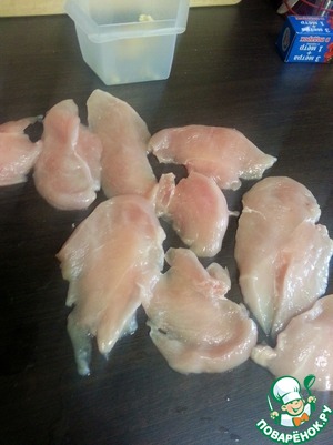 Режем куриную грудку на тонкие кусочки как для отбивных. Солим перчим, посыпаем чесноком.