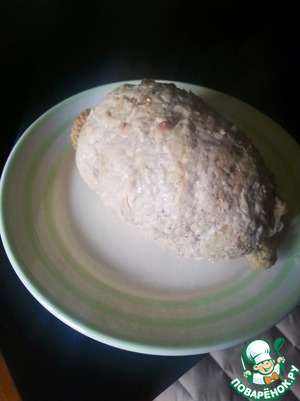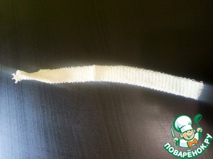 Достаем бинт, завязываем с одного конца узлом и очень плотно утрамбовываем в него курицу, после завязываем узел с другой стороны. Если бинта нет, плотно обвязываете куриный рулет нитками.