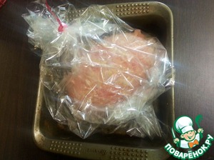 Кладем нашу курицу в пакет для запекания, плотно завязываем и делаем сверху небольшие дырочки. Кладем все в противень и в нагретую до 220 градусов духовку на 45 минут.