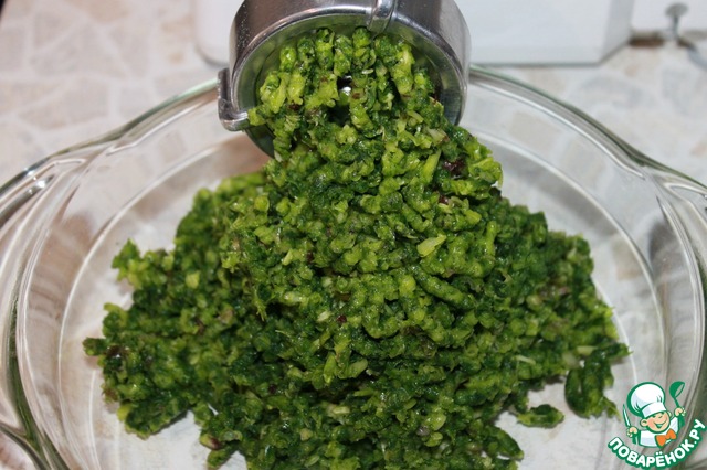 Прокрутить через мясорубку. Добавить соль, оливковое масло и хорошо перемешать.