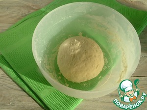 Для опары распускаем дрожжи (закваску) в 100 мл теплого молока, добавляем 1 ст. ложку сахара, 150 г муки и замешиваем мягкое тесто. оставляем в теплом месте для подъема на 1 час (в случае с закваской на 4-6 часов).