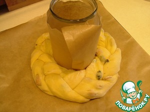 Соединяем её в венок. Для того, чтобы при расстойке и выпечке сохранить внутреннее кольцо, я обернула косу вокруг банки. С ней и пекла. Расстойка в тёплом влажном месте 45-60 минут для дрожжевого и 2-3 часа для заквасочного теста. Выпекаем 1 час в предварительно разогретой духовке при 190-200С, можно с паром первые 15 минут.