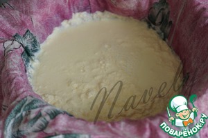Получившуюся творожную массу откинуть на марлю, сложенную в несколько слоев, а еще лучше на неплотную ткань. Дать стечь сыворотке, затем завязать и подвесить, оставить так на всю ночь.