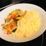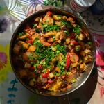 Нарезать баклажан кубиками, черешковый сельдерей нарезать мелко. Добавить к обжаренным овощам.